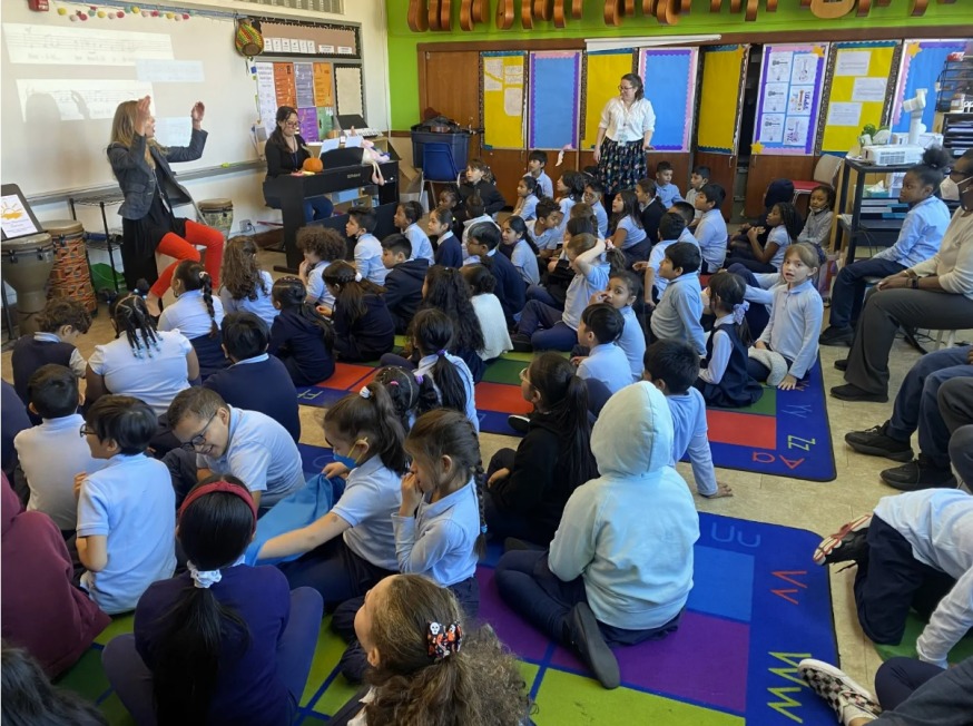 Students participate in a music class at VOICE charter school. The school has focused on integrating new students into social and extracurricular activities. Michael Elsen-Rooney / Chalkbeat