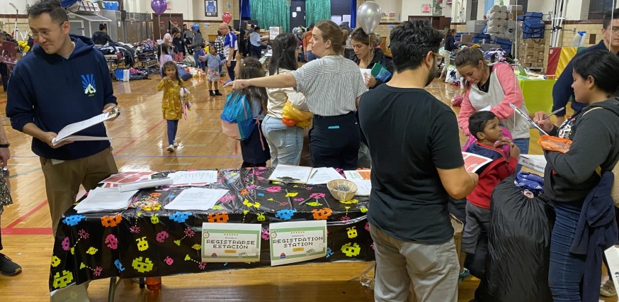 In the school’s ground floor gymnasium, parents who had recently migrated from Venezuela and other Latin American countries to seek asylum in the U.S. perused tables stacked high with warm winter gear, pots and pans, and school supplies. Students in light blue uniforms munched on pizza and played with toys and balloons.