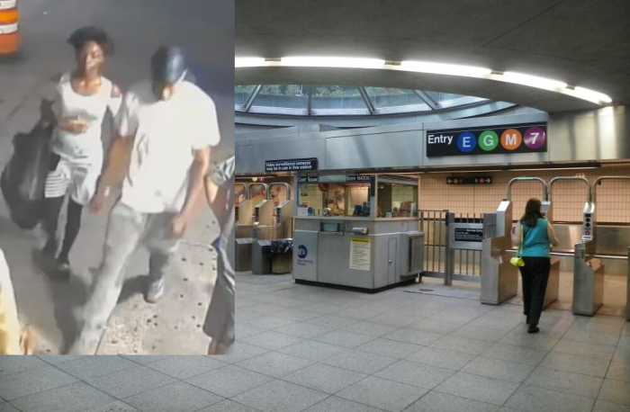 The NYPD released surveillance images of the suspect as he walked through the station carrying the gray backpack with black shoulder straps. The assailant wore a dark hooded sweatshirt over a white T-shirt, blue jeans, and white sneakers.