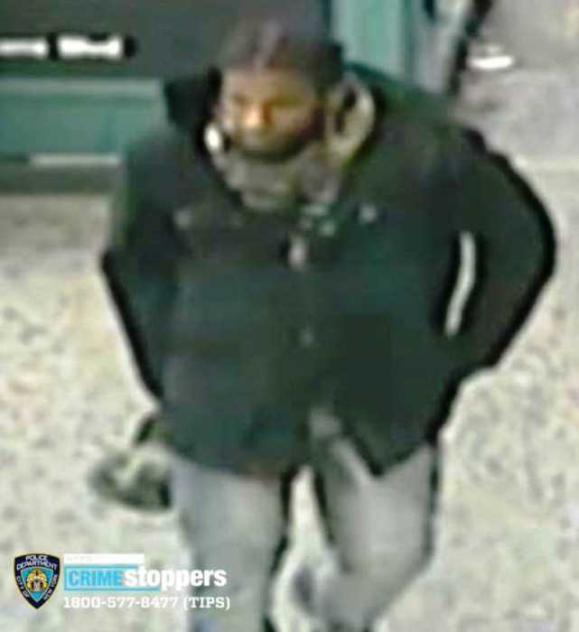 The NYPD on Nov. 3 released video surveillance that shows the suspect casing the lobby before entering the mail area. He had a beard and a “man bun” and wore a white T-shirt, a gray winter jacket with a fur-lined hood, black pants and black sneakers.
