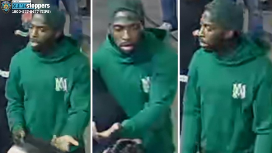 Police released images of the man wanted for questioning late Sunday. The suspect, who has a dark complexion, can be seen wearing a green hoody and green baseball cap.