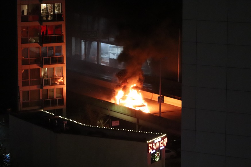 The vehicle was on fire for several minutes before it suddenly exploded leaving off a thunderous bang that could be heard several blocks away.