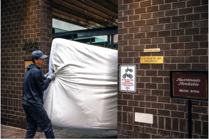 Disposal crews removing a mattress from 429 East 52nd Street after an e-bike battery sparked a fire, Nov. 11, 2022. Hiram Alejandro Durán/THE CITY