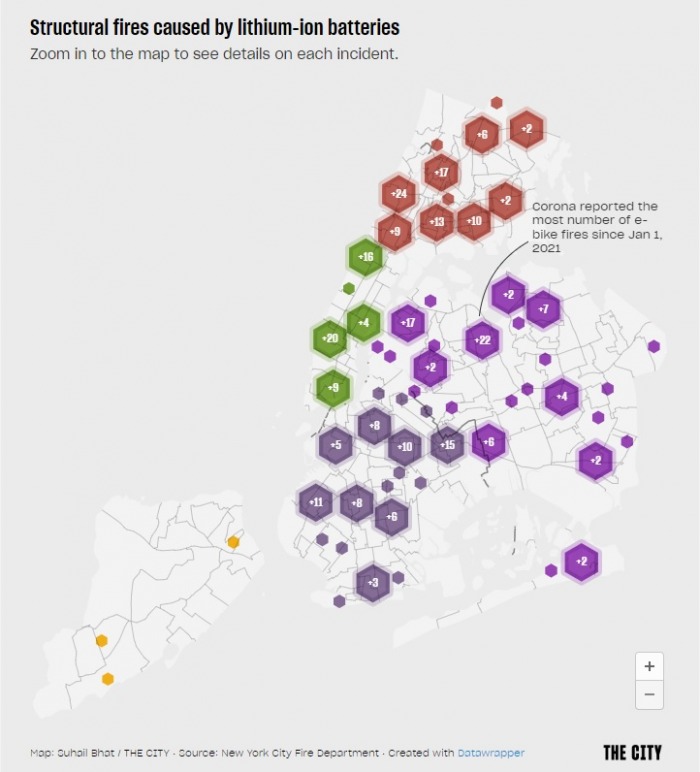 With such incidents on the rise, THE CITY obtained fire department data that details the location of all 221 structural fires across the city that the FDNY has blamed on exploding e-bike batteries from Jan. 1, 2021 through last week.
