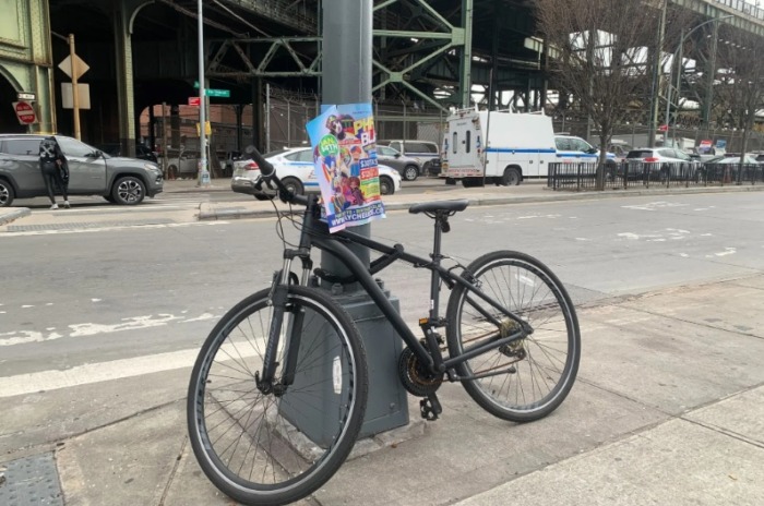 The MTA planned to add bike racks outside the Broadway Junction station — so bike owners don’t have to secure their ride this way — in Brooklyn, Jan. 11, 2023.Jose Martinez/THE CITY