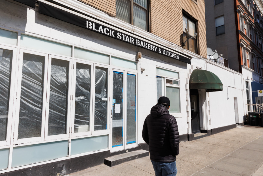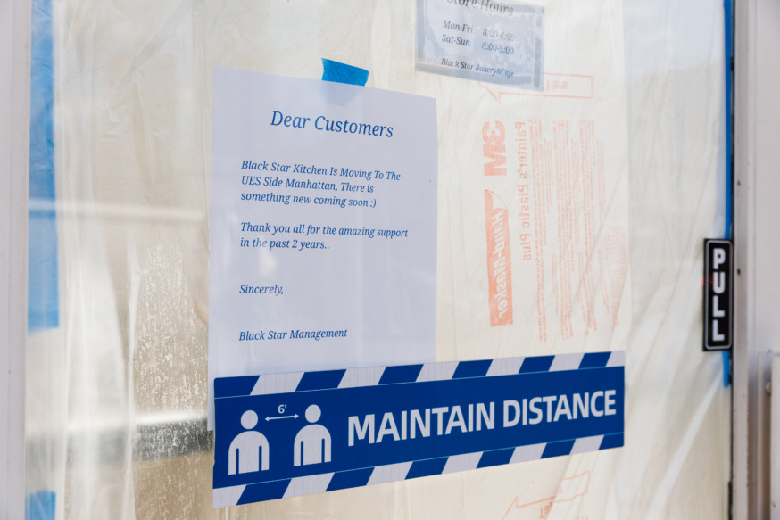 A sign on one of the windows reads: “Black Star Café is moving to (UES) Upper East Side Manhattan. There is something new coming soon. Thank you all for the amazing support over the last two years.”