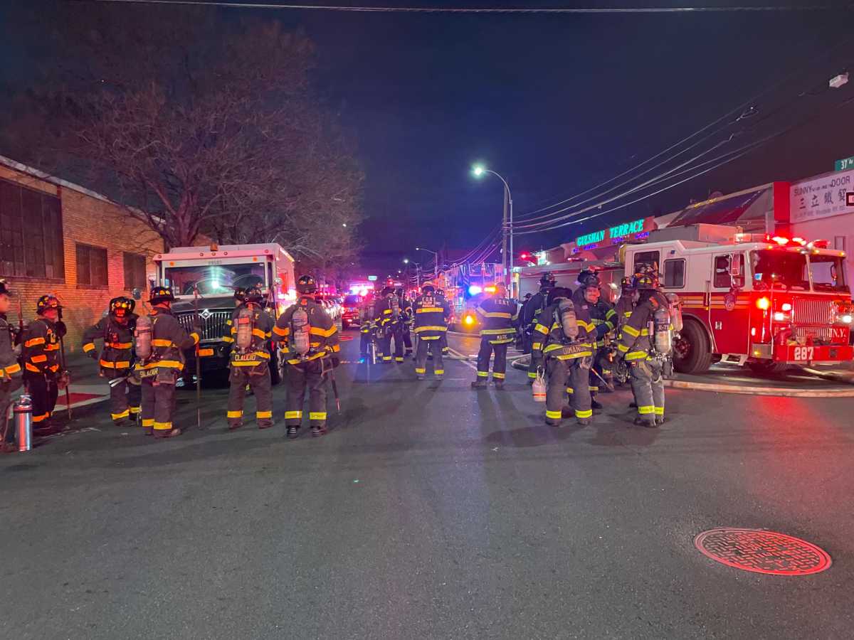 A mayday was declared at the fire by a member and all companies were evacuated for an emergency headcount. When all members were accounted for, FDNY personnel used two tower ladders and eight hose-lines to place the fire under control by 12:15 a.m. Wednesday morning.