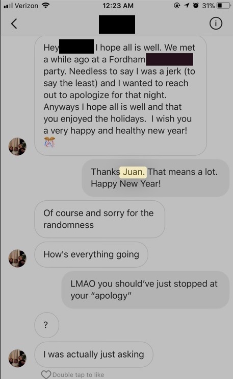 “Needless to say I was a jerk (to say the least) and I wanted to reach out to apologize for that night,” Ardila wrote. “Anyways I hope all is well and that you enjoyed the holidays. I wish you a very happy and healthy new year!”