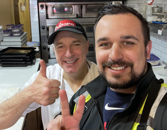 Pizzeria owner Dave Acocella (left) with his buddy, tiktoker Kenny Bollwerk at Philomena’s Pizza, in Sunnyside. Courtesy Dave Acocella