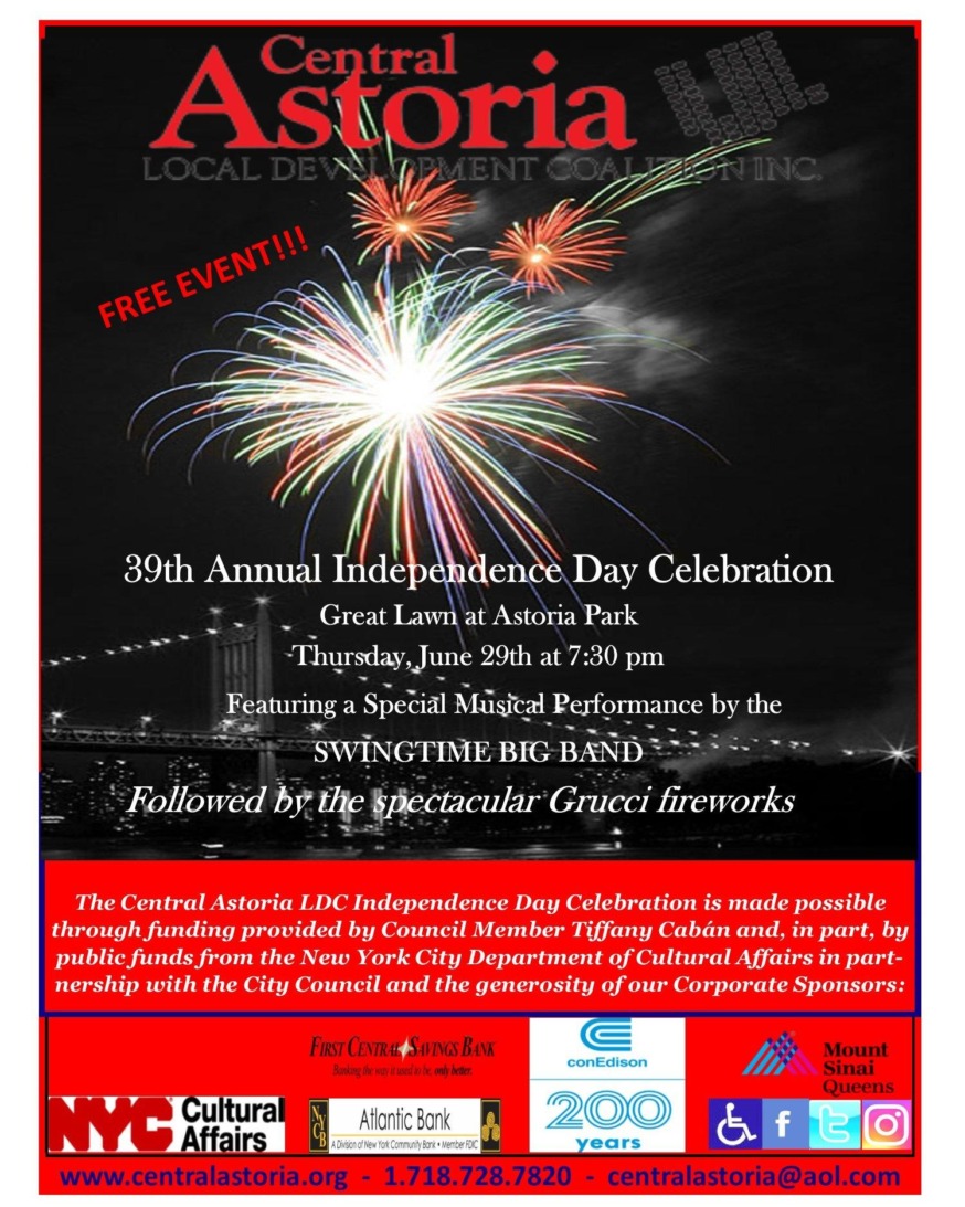 The Central Astoria Local Development Coalition (LDC) Inc. is hosting its early Independence Day celebration on the Astoria Park Great Lawn, on Shore Boulevard between the Hell Gate Bridge and the pool, on June 29 at 7:30 p.m.