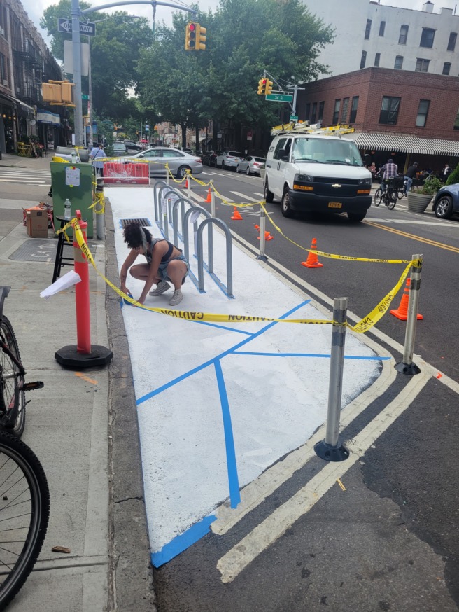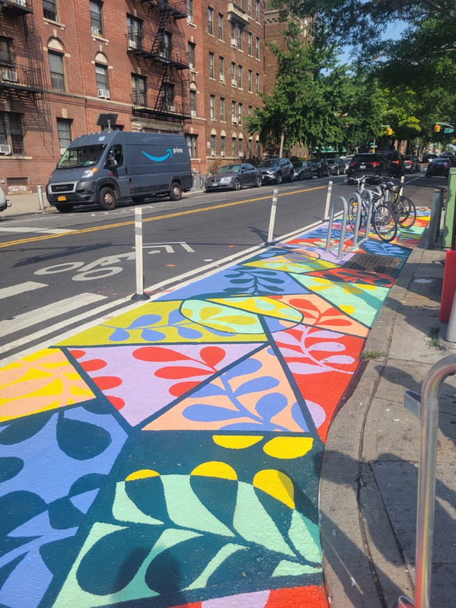 The new mural on the bike corral at 31st Avenue and 34th Street in Astoria is full of bright colors, shapes and designs that intersect and overlap individually and harmoniously, not unlike the different cultures that comprise the community.