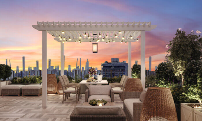 Amenities include a lush rooftop with Manhattan views, a pergola, dining and lounging areas and a barbecue. The building also has a fitness center, a virtual doorman which oversees the package room, storage units, bike storage and an underground parking garage.