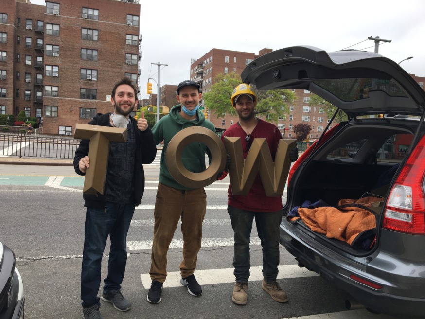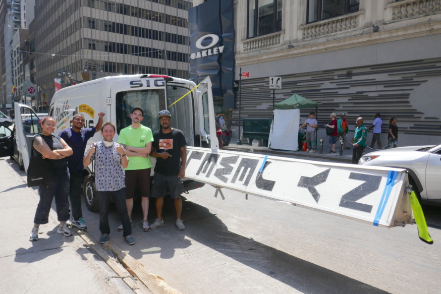 The sign salvage crew about to take down the H Goodman Furs sign, with David Barnett, second from the left, and Michael Perlman third from the left (Photo provided by Michael Perlman)