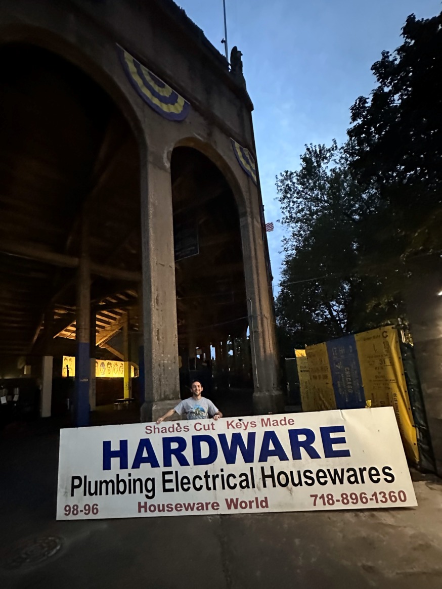 Perlman with the Housewares World Hardware store sign at the Forest Hills Stadium (Photo provided by Michael Perlman)