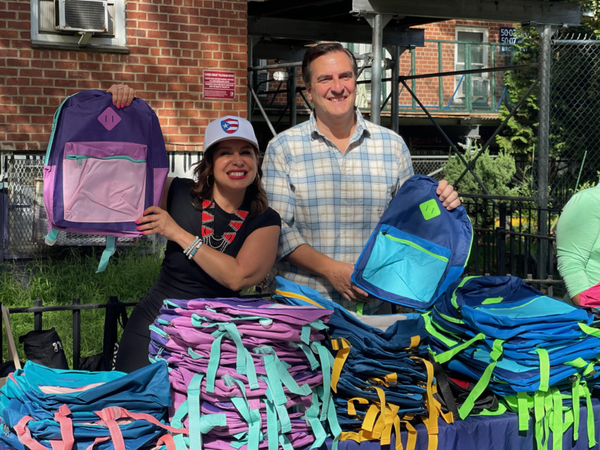A group of western Queens lawmakers handed out free backpacks to children at the NYCHA Woodside Houses last week to help them get ready for the first day of class on Sept. 7. (Photo via Twitter)