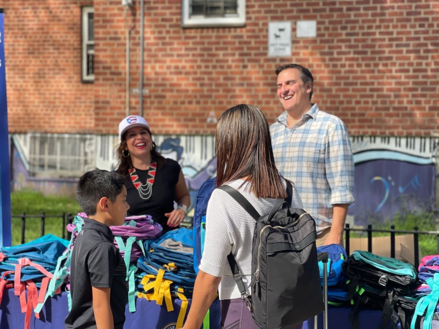 A group of western Queens lawmakers handed out free backpacks to children at the NYCHA Woodside Houses last week to help them get ready for the first day of class on Sept. 7. (Photo via Twitter)
