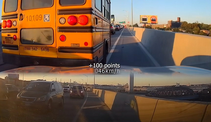 He then attempts to squeeze up the inside of a yellow school bus but doesn’t have enough room and appears to collide with the vehicle, leading to “+100 points” popping up on the screen.