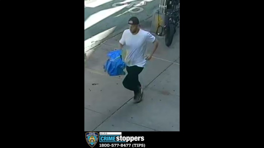 The NYPD released a surveillance image of the suspect on Oct. 26 and described him as having a light complexion. He is approximately 5 feet, 11 inches tall and was last seen running from the station wearing a white T-shirt, black pants, gray sneakers and a black baseball cap worn backwards. He was also seen carrying a light blue plastic bag with unknown contents.