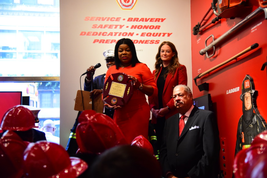 “Today is one of our most important events because fire safety outreach is one of the main ways we keep people safe and reduce the number of serious fires we have in our city,” Kavanagh said. “This school is extraordinary. They quickly mobilize to help educate their community after an intense fire caused by lithium-ion batteries. For their efforts, they are receiving the Chief William Feehan Fire Safety Education Award, which goes to a city school that demonstrates an ongoing commitment to fire safety education.”
