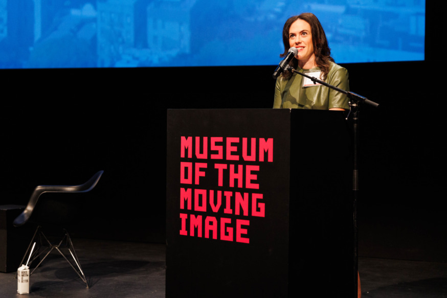 Long Island City Partnership president Laura Rothrock delivers welcoming remarks at The Museum of the Moving Image. (Photo by Paul Frangipane)