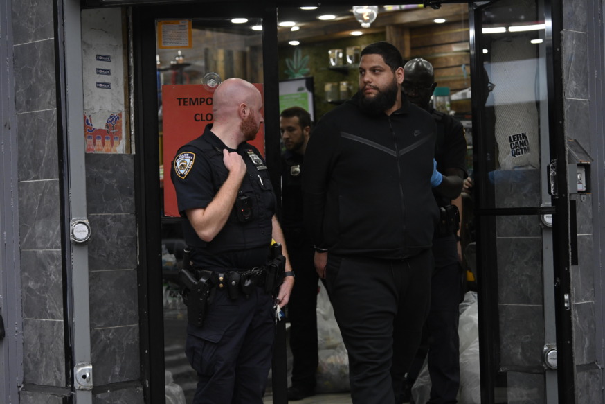 A store worker was taken into custody and led out of the corner storefront but an NYPD spokeswoman could not provide his identity or what crimes he is being charged with while the Sheriff’s Office was still taking inventory of the seized illegal cigarettes and marijuana products.