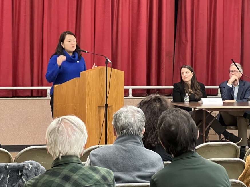 Western Queens Councilwoman Julie Won addresses the town hall’s attendees. (Photo by John Schilling)