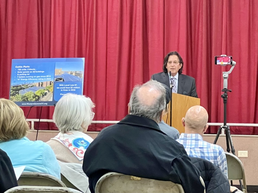 Celtic Park President Charles Herzog echoed Mazel’s plea by talking about his housing co-op’s own green efforts not acknowledged by Local Law 97. In its 756 units, 25 buildings and two blocks, Celtic Park enjoys numerous trees and courtyards, as well as LED lights, modernized elevators, oil to gas conversions and solar panel installations.