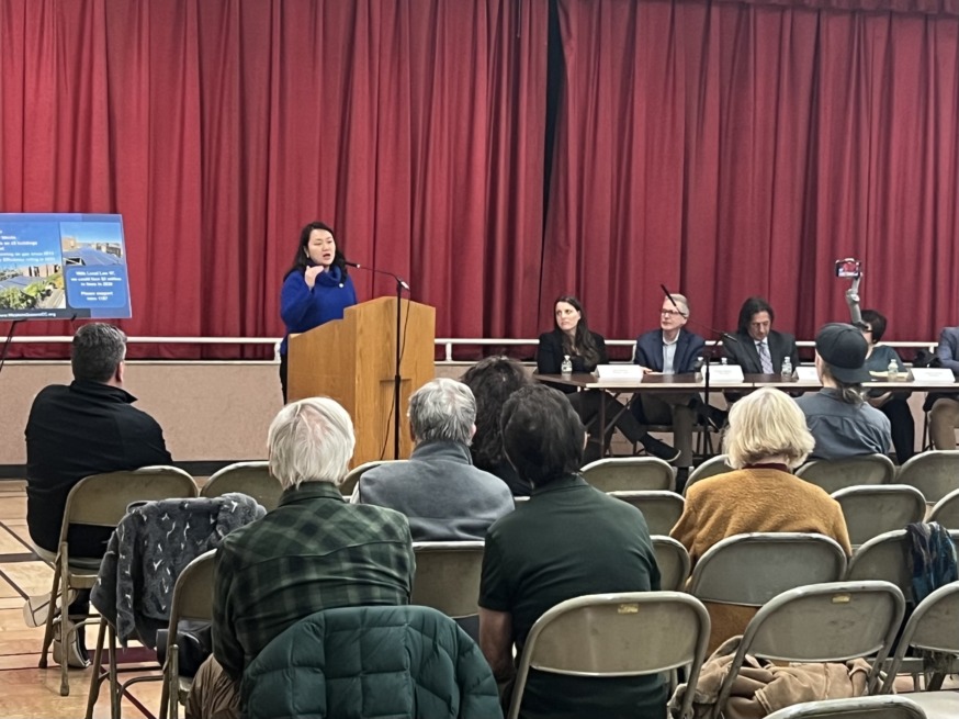 “I’m happy to say that I’m committed to making sure that I support Intro 1197,” Won said, resulting in applause. “I love the idea of making sure that solar panels, other wind power, whatever it is that we can do to make sure that we’re minimizing fines,” she added. “It should be calculated by income level, not just by cost, and it makes no sense to me why homeowners were exempt.”
