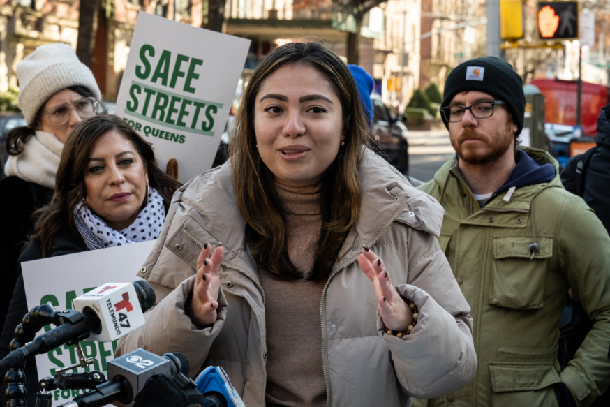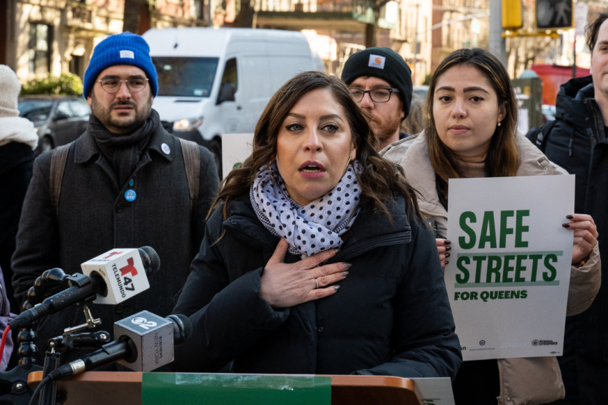 Assemblymember Jessica González-Rojas speaks at a press conference introducing the Western Queens Street Safety Plan in Astoria on Nov. 28, 2023. (Photo by Gabriele Holtermann)