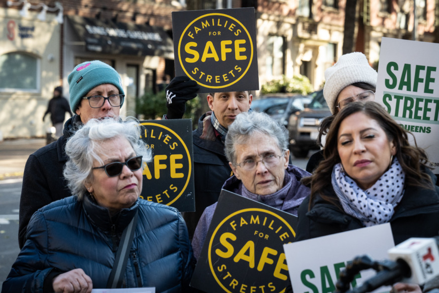 Street safety advocates attend a press conference introducing the Western Queens Street Safety Plan in Astoria on Nov. 28, 2023. (Photo by Gabriele Holtermann)