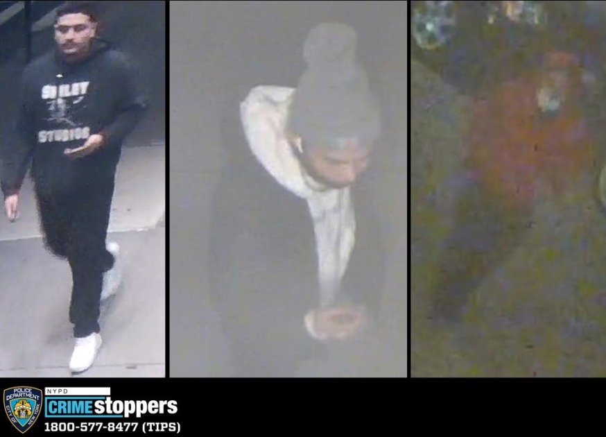 Police released surveillance images of the three suspects on Thursday. One wore a black hooded sweatshirt with white lettering across the chest, dark pants and white sneakers. The second suspect wore a black jacket over a white hoodie, and a gray winter hat and the third man wore a red hooded sweatshirt. Anyone with information is asked to call the NYPD’s Crime Stoppers Hotline at 1-800-577-TIPS.