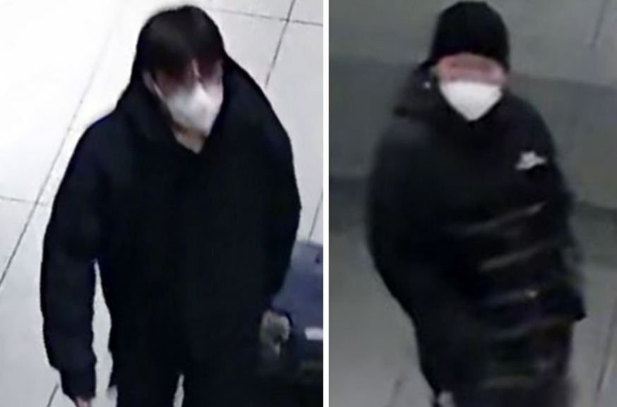 The second suspect had black hair and he was wearing a black winter jacket, black pants and white sneakers with a white face mask and glasses and he was pulling a rolling piece of luggage.