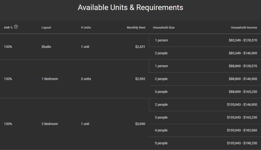 The units are for residents who earn about 130 percent of the area median income (AMI), ranging in eligible income from $83,349 to $198,250—based on family and unit size.