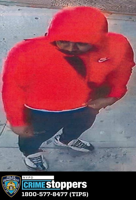 The NYPD released surveillance images of the suspect on Friday and described him as having a light complexion, approximately 5’8” tall, with a slim build. He wore a red Nike hooded sweatshirt, black sweatpants, a black mask and white and black sneakers.