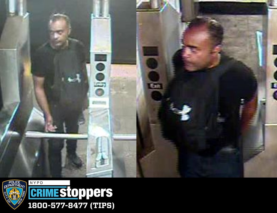 The NYPD released surveillance images of the perpetrator as he passed through the turnstile and described him as having a dark complexion, approximately 5’7” tall and 150 lbs. He wore a black T-shirt, black pants, black sneakers and a black book bag. A reward of up to $3,500 is being offered for information that leads to his arrest.