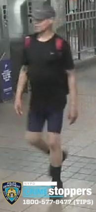 The NYPD released surveillance images that showed the suspect walking through the station and described him as having a light complexion. He wore a black T-shirt, black shorts, a black baseball cap and black sneakers and black socks. He also wore a black backpack with red traces on the shoulder strap.