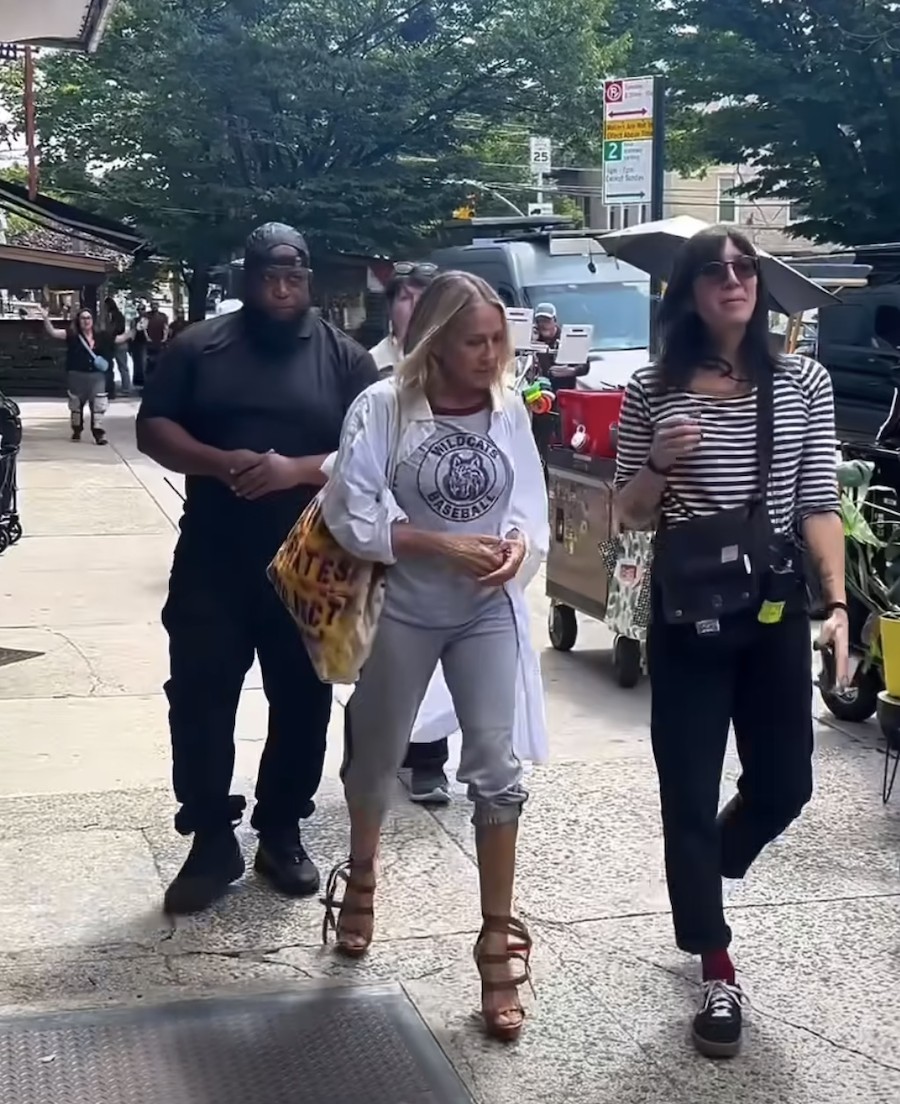 But soon she spotted ‘And Just Like That…’ splashed on the back of the directors’ chairs and hats and it was confirmed. While containing her excitement, she captured SJP walking past the establishment on her phone.