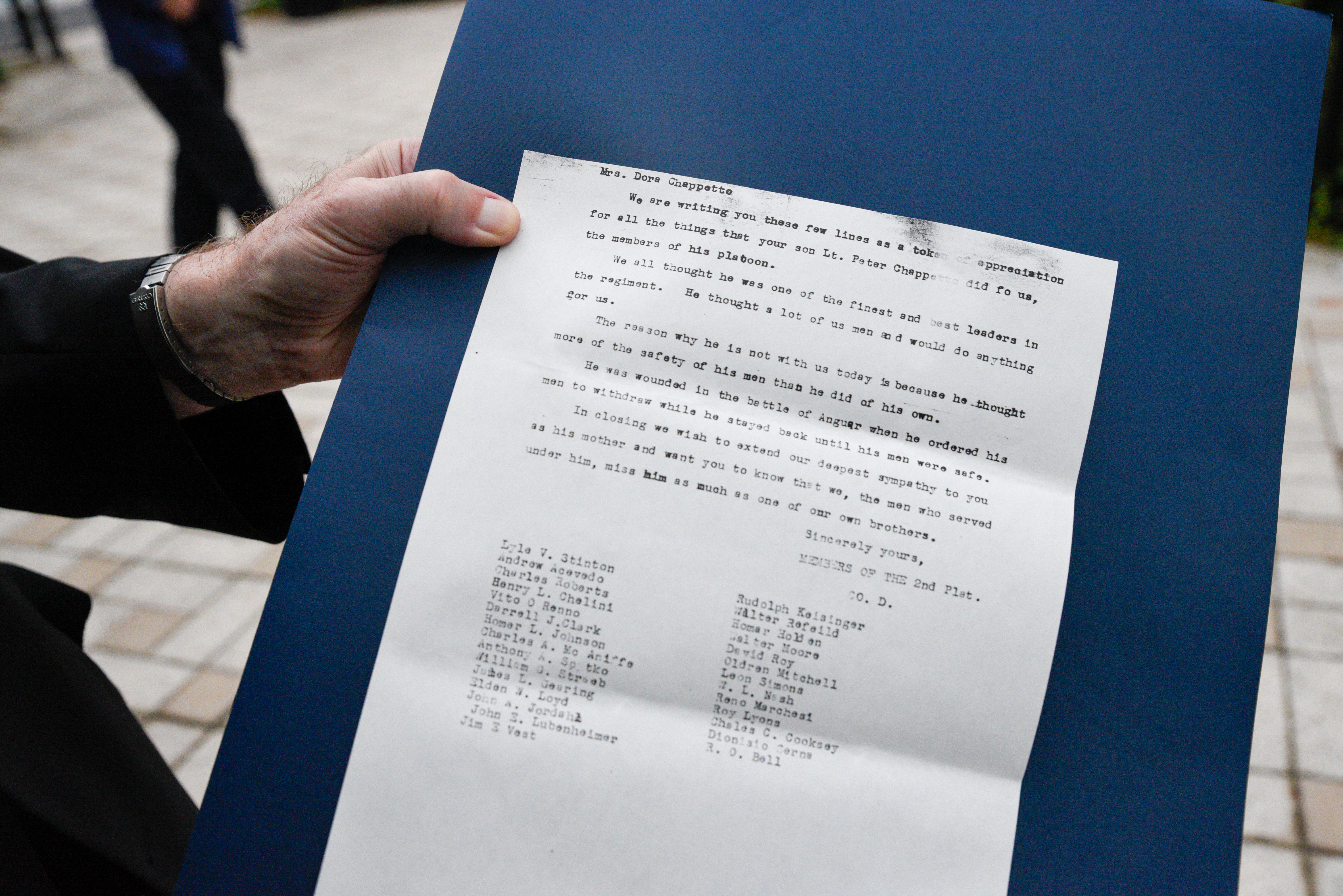 “We are writing you these few lines as a token of appreciation for all the things that your son, Lieutenant Peter Chappetto, did for us, the members of his platoon. We all thought he was one of the finest and best leaders in the regiment,” read the letter signed by 28 soldiers. “The reason why he is not with us today is because he thought more of the safety of his men than he did of his own. We, the men who served unto him, miss him as much as one of our own brothers.”