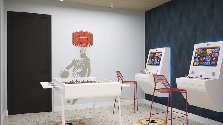 Other amenities throughout the building include a shared laundry room, a dog washing station, bike storage lockers, common area Wi-Fi, a gymnasium, a yoga/dance studio, a children’s playroom, a community center, a recreation room, a rooftop terrace, and security cameras.