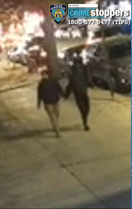 The NYPD released surveillance video of the suspects as they walked along Liberty Avenue and described one as having a slim build and dark complexion and was last seen wearing a black hooded sweatshirt, black pants with white stripes, and dark-colored sneakers. The second suspect is described as having a medium build and a light complexion. He wore a blue sweatshirt and tan pants.