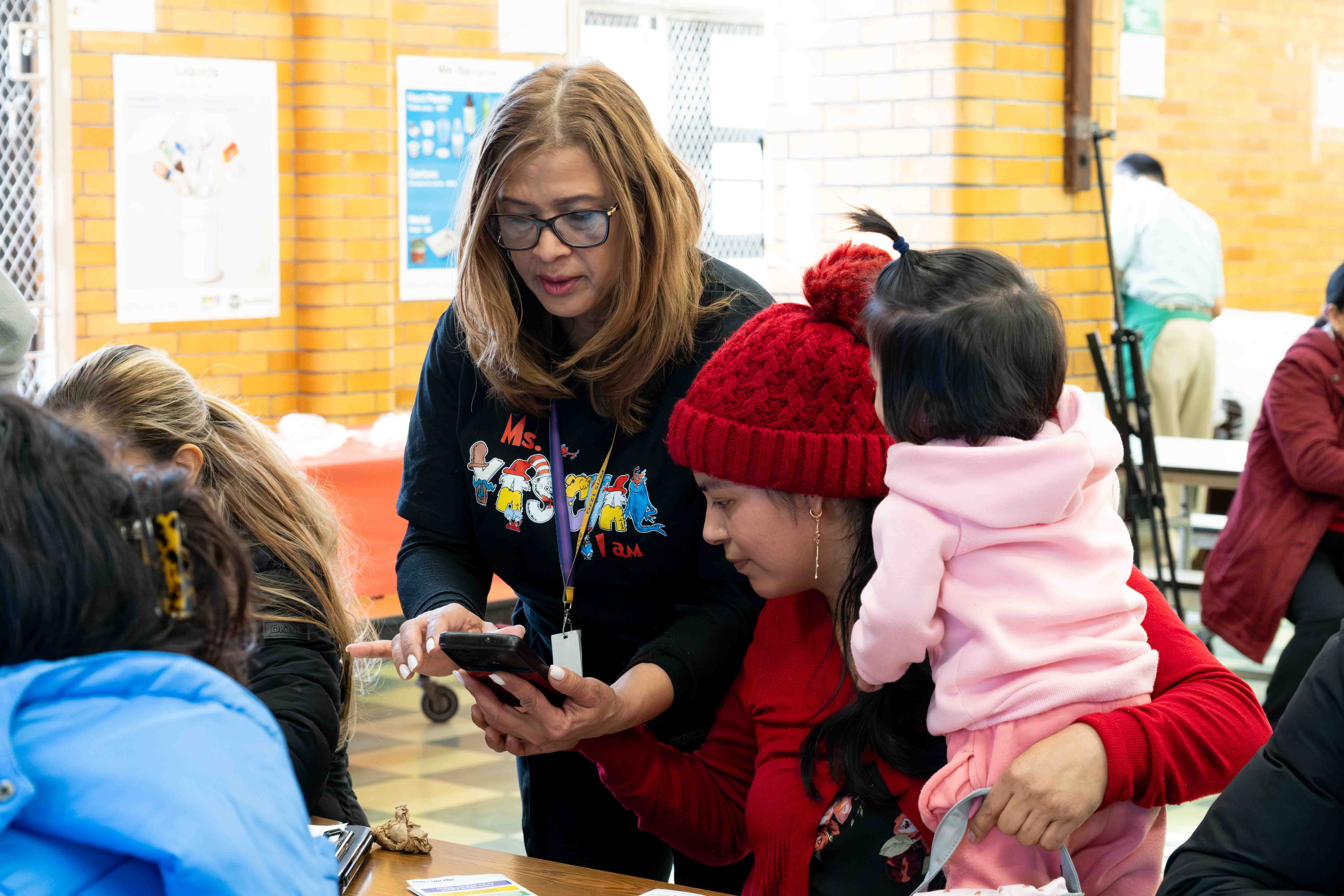 A P.S. 127 Aerospace Science Magnet School school team member supports a parent to activate her child’s NYC Scholarship Account online at nyckidsrise.org/activate at the school’s NYC Scholarship Month celebration and bilingual, English-Spanish workshop. Photo by Kat Klopp for NYC Kids RISE (January 16, 2025)