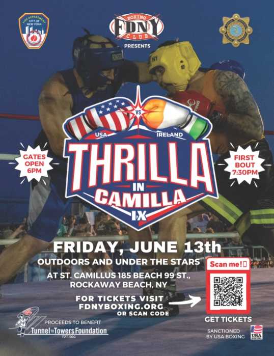 The event, sanctioned by USA Boxing, will be held outdoors at Saint Camillus—located at 185 Beach 99th St. in Rockaway Beach—where FDNY’s Bravest Boxing Club will go head-to-head with Ireland’s National Police and Security Service in a spirited evening of amateur boxing.