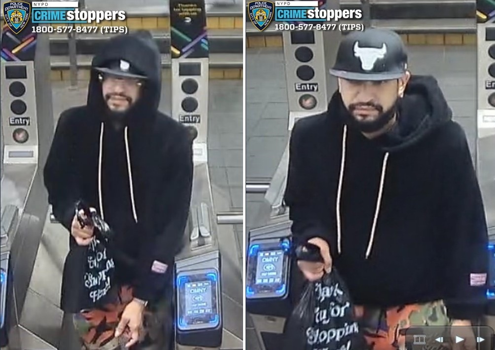 The NYPD put out a few security camera photos that show the suspect passing through the station turnstiles and described him as having a light complexion with a dark beard and mustache. He wore a black hooded sweatshirt with white drawstrings, a black Chicago Bulls baseball cap, and multicolored sweatpants.