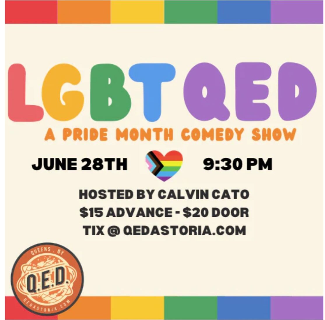 An advertisement of the LGBTQED Pride Month Comedy Show, slated for Saturday, June 28, a Pride Month event at Q.E.D. Astoria in Astoria. Photo via Q.E.D. Astoria on Facebook