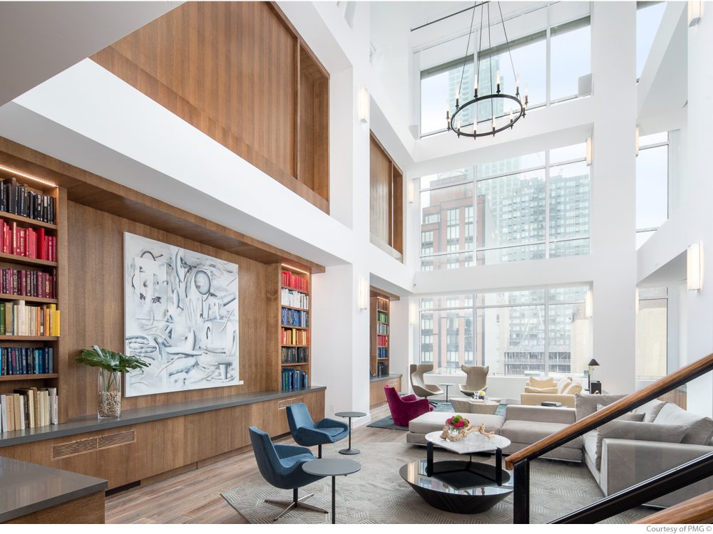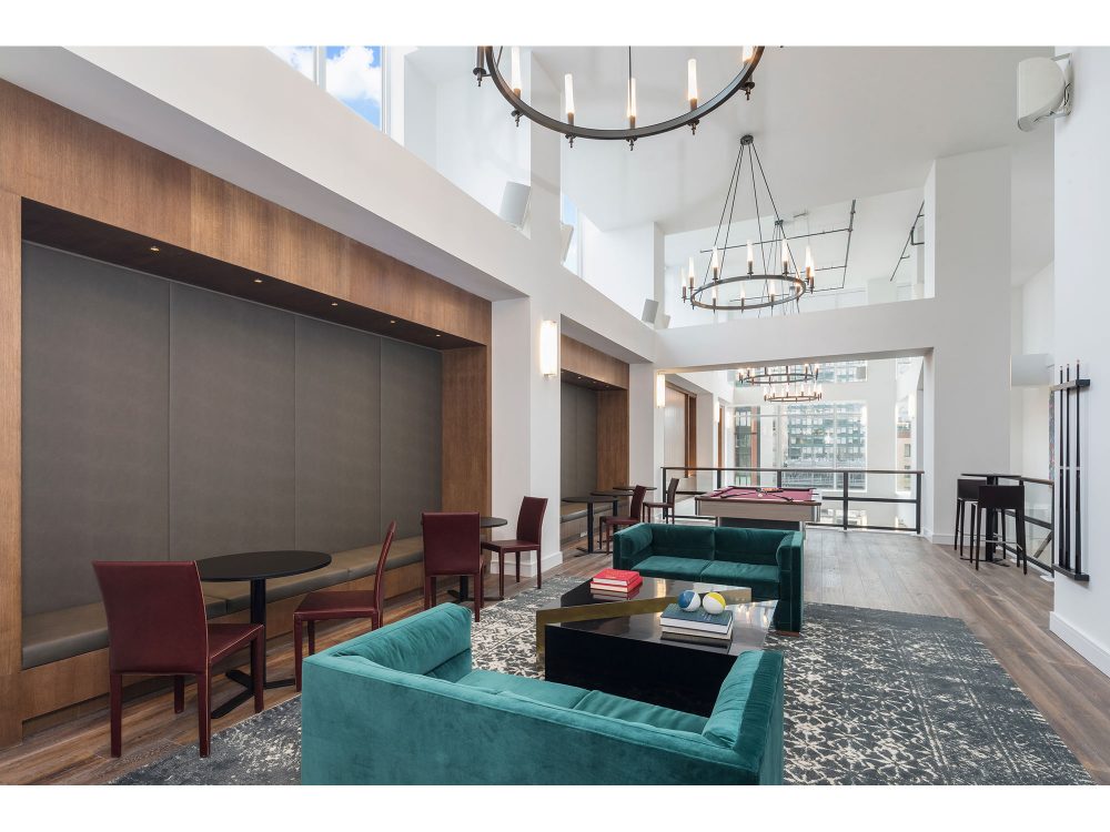 Amenities available to residents of 1 Queens Plaza South include a rooftop pool, two rooftop terraces, a fitness center that also features a professional rock-climbing wall, a yoga room, a game room with a billiards table, multiple lounges, a library, co-working spaces, a children’s playroom, a communal kitchen, a fireplace, an elevator, a 24/7 attended lobby and on-site valet service.