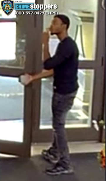 The NYPD released surveillance images of the suspect, who has a medium complexion. He wore a black long-sleeved shirt, dark-colored pants, and gray and white sneakers.