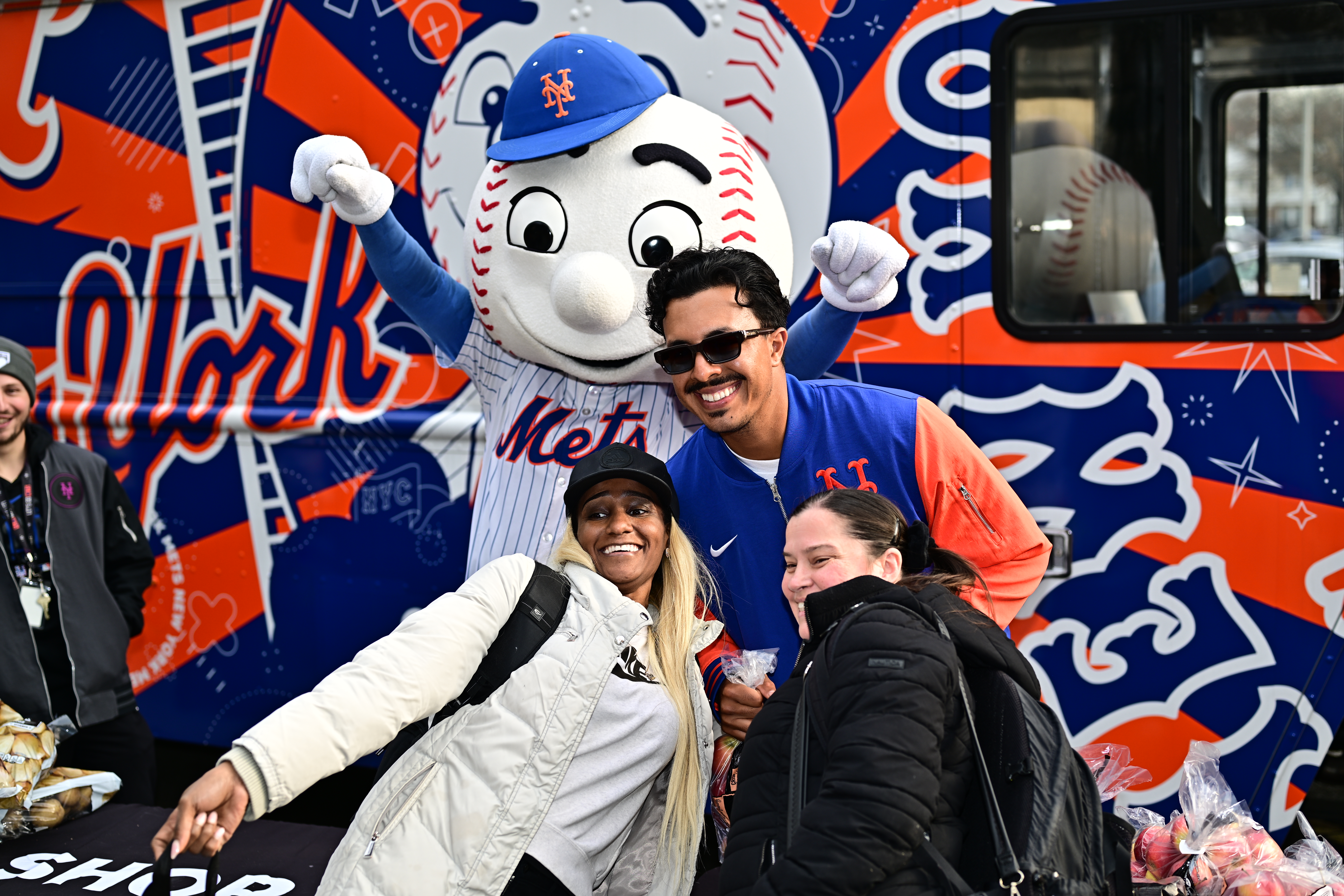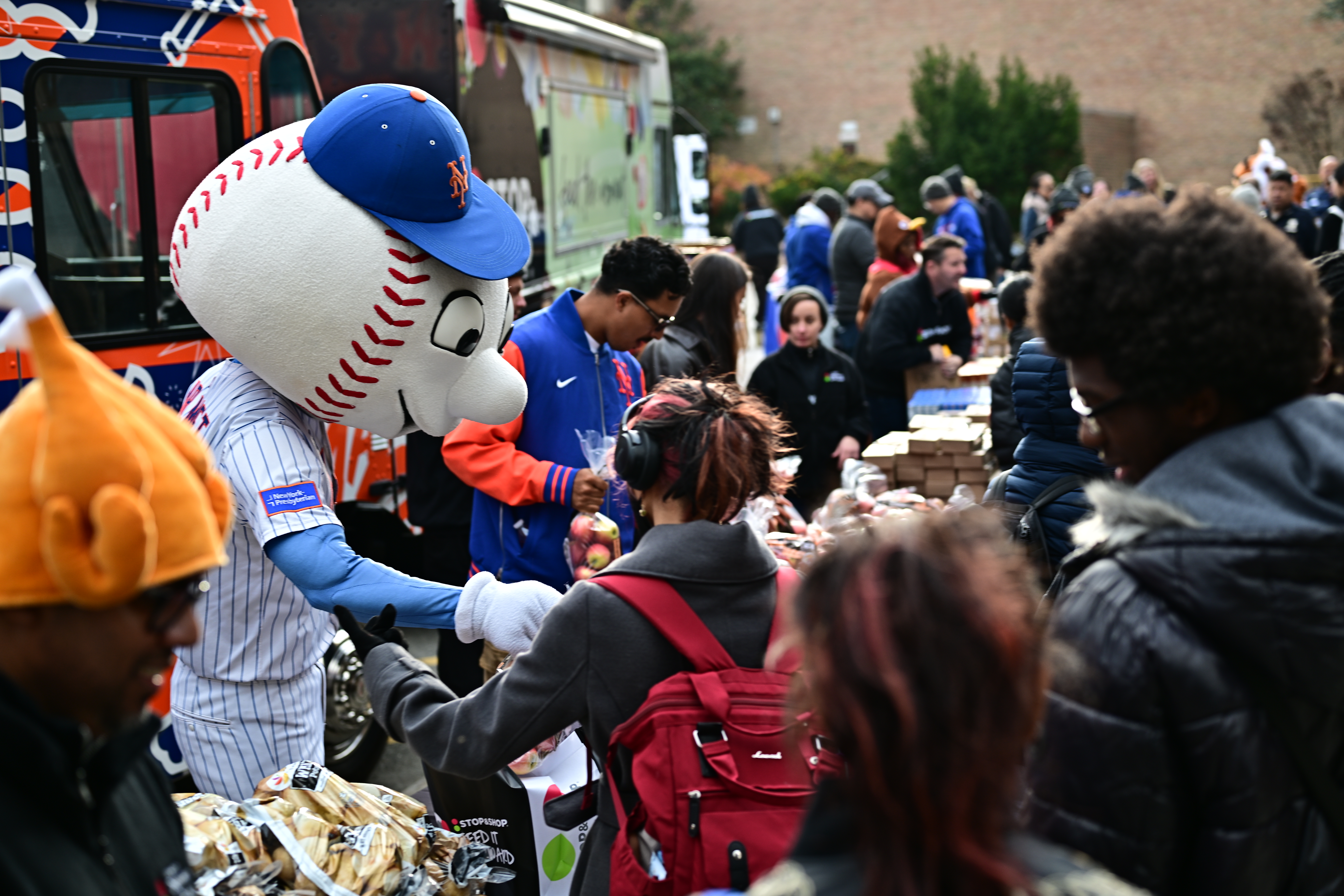 New York Mets infielder Mark Vientos and mascot Mr. Met made special appearances at the Queens turkey giveaway, where they assisted in giving away 350 turkeys and other Thanksgiving food to QCC students.