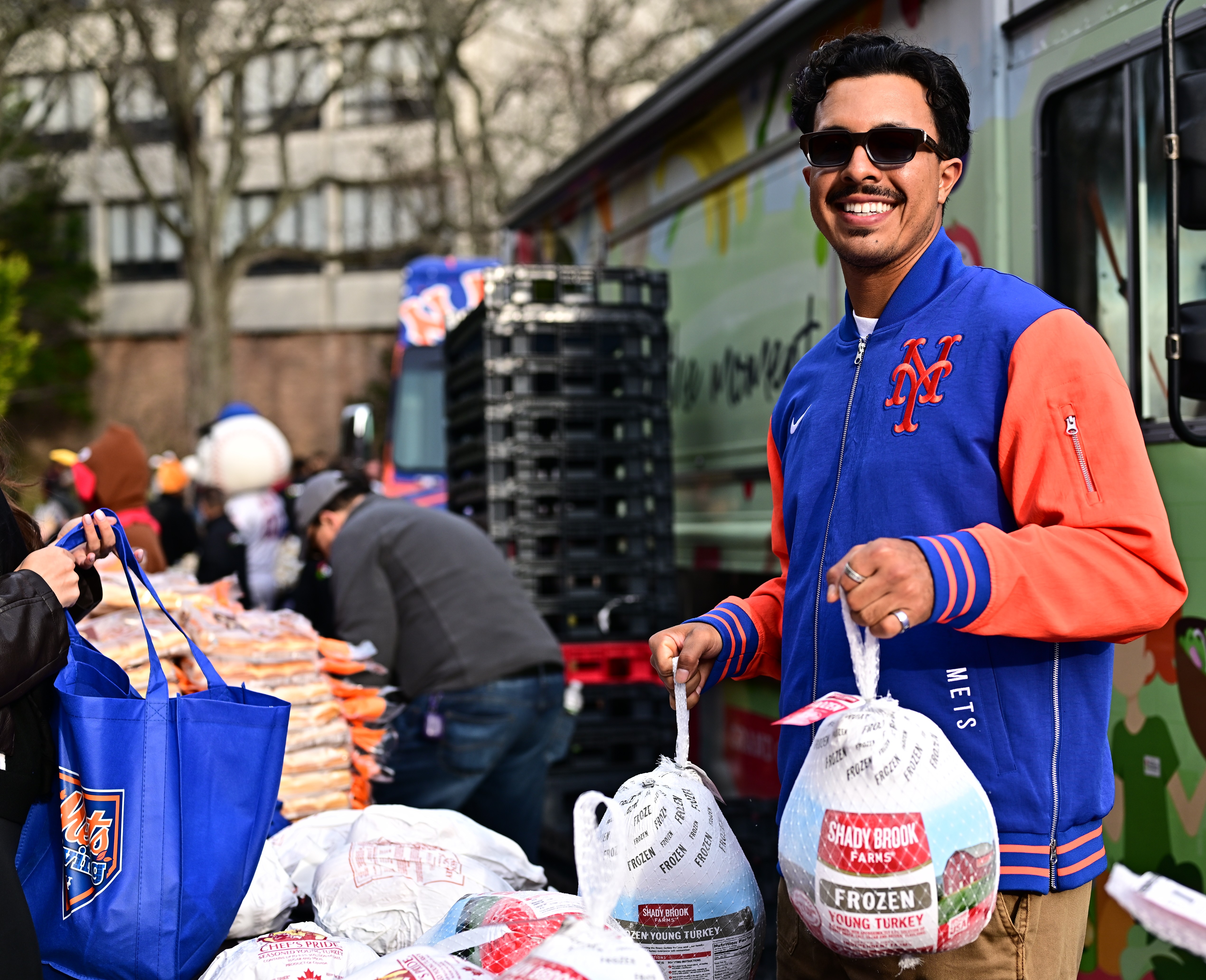 “We believe that everyone should be able to sit down and enjoy a holiday meal with their loved ones,” Karafian said. “We support Queensborough Community College through our Stop & Shop School Food Pantry program, where we support schools with on-campus pantries so that students have consistent access to healthy foods all year round. Today is a way to supplement the school’s food pantry to provide just a little bit of extra help. The holidays can be an especially challenging time. We also have been partnered with the Mets since June, where we’ve actually partnered and served over 20,000 meals to Stop & Shop school food pantries across Queens and Long Island. We’re just grateful to be here today to have such amazing partners like QCC and the Mets, who are as committed to fighting hunger as we are, and to be able to show the impact we’re able to make when we come together as a community.”