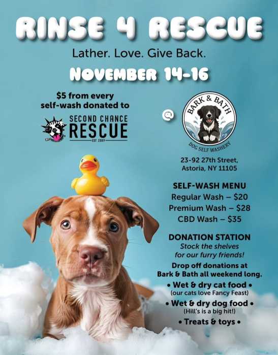 Rinse 4 Rescue’s hours this weekend include Friday and Saturday from 10 a.m. to 7 p.m., and Sunday from 11 a.m. to 5 p.m. To learn more about the self-service dog wash or NYSCR’s animal saving efforts, go to @barkandbath_astoria or learn more about NYCSCR at @nycscr on Instagram.