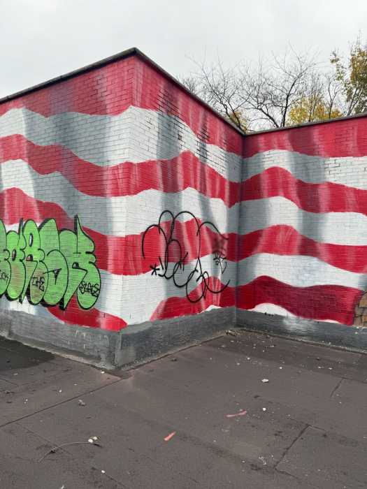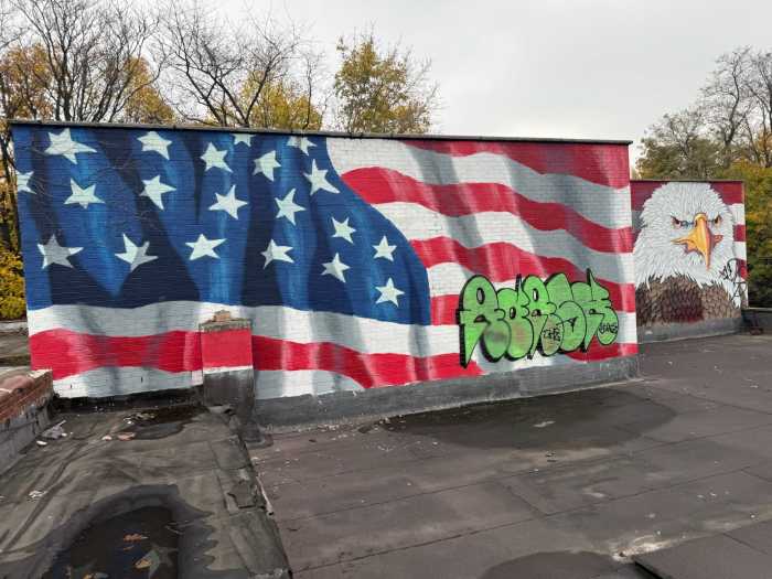 The murals, painted by a local artist known as Vers, abated the problem for close to seven years, until property owners found a rope leading from a nearby tree onto the roof and discovered the markings. The mural in question depicts the American flag and a bald eagle, and though most of the artwork was the vandalizer’s own tags, one did include the words “F*** ICE” within it.